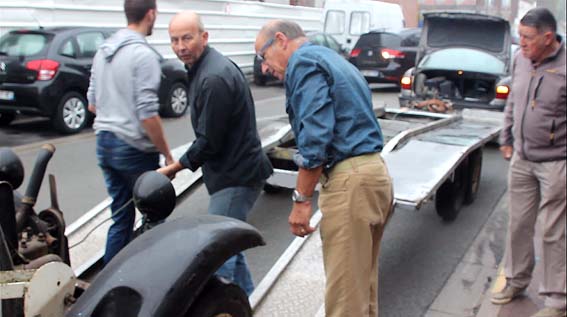Au bout de la route, nos chauffeurs chanceux ont du libérer à regret leurs charmantes autostoppeuses et nous avons pris la route de Tourcoing pour nous retrouver à la pizzeria DEL CORSO qui nous accueillait pour le repas traditionnel de fin de journée… Si, si : comme dans Astérix, sauf qu’en guise de sanglier, nous nous sommes délectés de copieuses pizzas et autres plats de pâtes. Entretemps, Max, Priscilla et moi avons ramené la Rosalie dans son nouvel écrin provisoire : le garage de notre ami Stéphane qui devait être parmi nous mais qui s’était excusé au dernier moment, terrassé par une mauvaise migraine… Il nous a tout de même ouvert sa porte pour rentrer la voiture, et il allait d’ailleurs déjà un peu mieux.