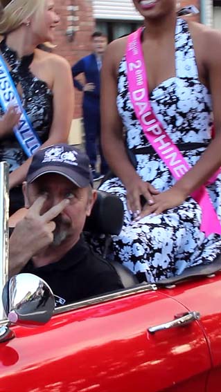 Par contre, à part ça rien n’a changé : on retrouve à peu près les mêmes joyeux lurons des éditions précédentes, toujours aussi bariolés… Même certains costumes ne changent pas, et ça, c’est un peu dommage, vous n’trouvez pas ? Ah si, ya quand même un ou deux trucs qui ont changé, et pas des moindres : le parcours était plus court, hélas. On s’est amusé un peu moins longtemps ! Et nous avons étoffé notre participation de 12 voitures supplémentaires qui ont escorté notre char, ce qui nous a permis de prendre en stop une horde de Miss qui passaient par là. J’en connais quelques uns qui ont bien apprécié la situation !