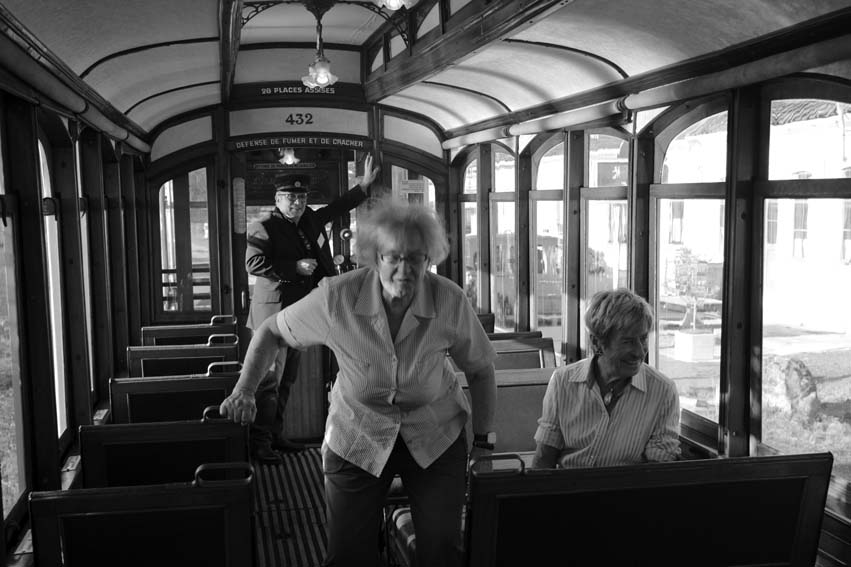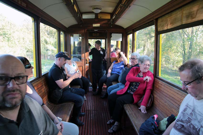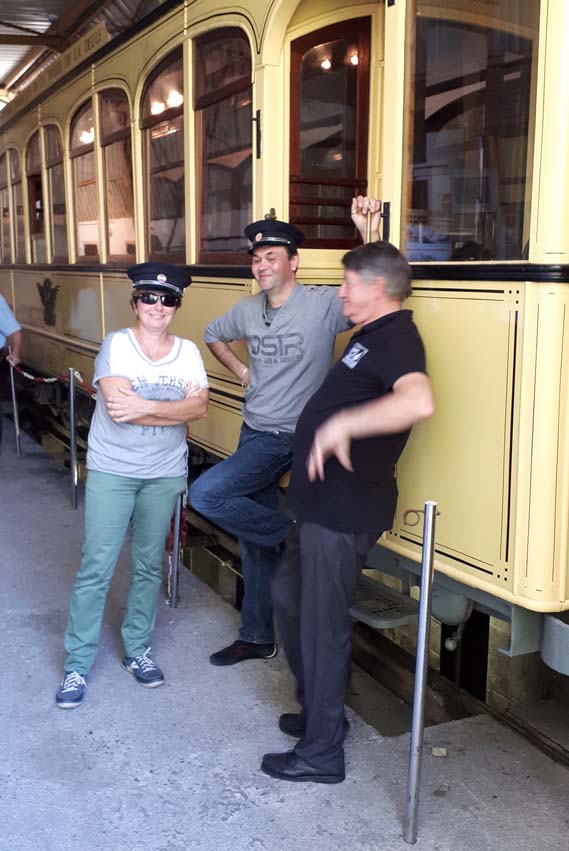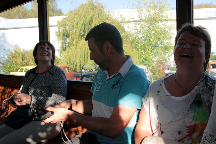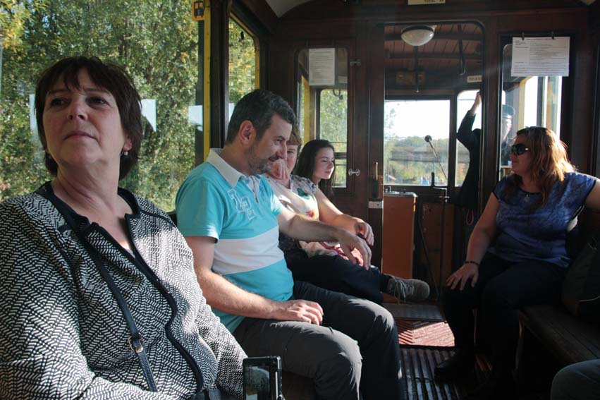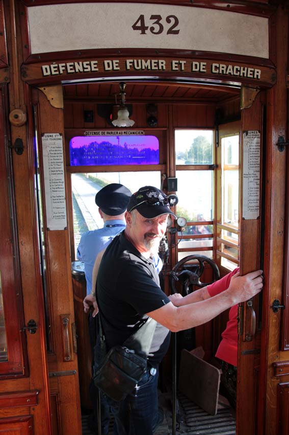 Le voyage, bien que très court, ne fut pas d’un confort inoubliable. Ces vieilles guimbardes, bien que robustes et fiables, ne se déplacent qu’en tremblant et cahotant ça et là, le tout agrémenté d’un bruit incessant de frottements de ferraille et de bois. Mais c’est tant mieux car c’est exactement ce qu’on était venu chercher : du pittoresque, de l’aventure, du rétro, bref du dépaysement ! Et en cela, ce fut très réussi : d’abord, chacun de nous a pu embarquer dans les deux motrices, l’une après l’autre. Nous nous étions séparés en deux groupes, chacun à bord d’une machine et avons permuté au retour. Et nos hôtes avaient joué le jeu jusqu’au bout, arborant de magnifiques et véritables uniformes de machinistes.