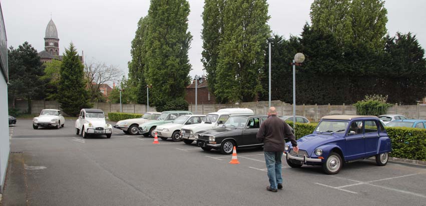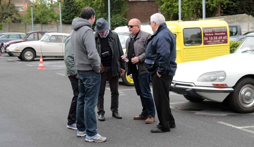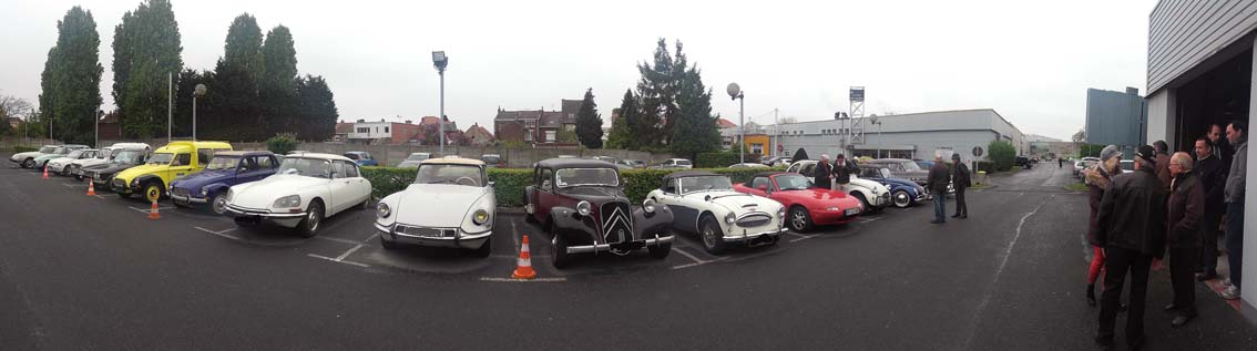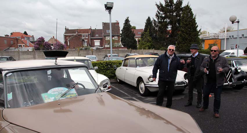 Bref, nous nous sommes donc retrouvés à 16 aventuriers ce matin-là, sur le parking de la mairie d’Halluin. Votre serviteur a offert le café, le thé et les viennoiseries afin que personne ne parte le ventre vide. On a pu constater, une fois tous présents, deux nouveautés notoires : c’était la première sortie club sans DS (désolé pour IDéale DS, ça n’avait rien de personnel !) et la première sortie également avec une moto dans le cortège… Et oui, pour ceux qui ne le savent pas encore, une nouvelle recrue motarde et féminine est venue grossir les rangs de notre belle association. Et elle a chevauché fièrement sa KAWAZAKI EL252 sur les quelques 200km de la journée… …Heureusement, il n’a pas plu !!!
