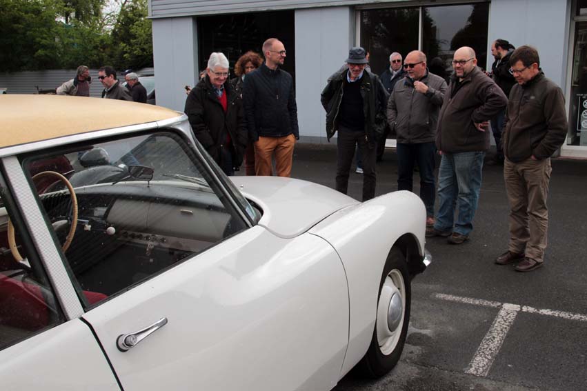Bon, revenons à nos moutons ! J’ai donc eu la surprise ce matin, en me rendant comme chaque fois au Rassemblement LAURIE, de découvrir que la marque SAAB avait fabriqué des serpents… Heu, non ! Pardon : des petites sportives séduisantes aux lignes très éloignées des SAAB plus courantes que nous avons l’habitude de croiser dans notre univers de passionnés. En effet, Jean-Louis DEP, le spécialiste SAAB du club, vu qu’il est le seul à en posséder, est venu au volant d’une Sonett 3 de 1971, aussi connue sous le nom de SAAB 97. Nous étions nombreux en admiration devant ce bolide. Mais Jean-Luc C a été le seul à constater que les jantes n’étaient pas d’origine : quelle faute de goût ! …Par bonheur, Jean-Louis DEP possède les bonnes jantes, qui lui avaient été fournies démontées avec la voiture. Côté nouveautés, une fois de plus, on n’aura pas été déçu : décidément, ce rassemblement LAURIE est une mine de curiosités ! Pourvu que ça dure… Et ce mois-ci, outre la Sonett 3, nous avons accueillis deux magnifiques Dauphines aux couleurs pastel, une Karmann gris métal rutilante et la 2cv Charleston de Jérémy et Catherine N : un bon cru, en somme, que ce joli mois de mai, avec 22 voitures sur la matinée et une moto !
